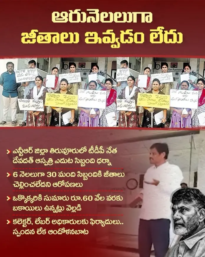 6 నెలలుగా జీతాలు ఇవ్వకుండా తన ఆసుపత్రి సిబ్బందికి టీడీపీ నేత దేవదత్ బెదిరింపులు మీరు ఎవరికి చెప్పుకుంటారో.. చెప్పుకోండి.. నాకు ఏం భయం లేదంటూ వెటకారం . జీతాలు చెల్లించని విషయం మీడియాకు లీక్ చేశారని సిబ్బందిపై పెరిగిన వేధింపులు. నీ అండ చూసుకునే కదా Nara Chandrababu Naidu .. ఈ దేవదత్ ఆ సిబ్బంది జీవితాలతో ఆడుకుంటున్నాడు.